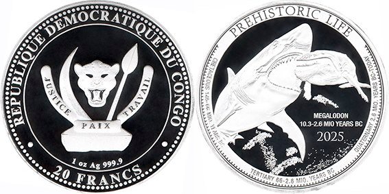 ![]() | 20 Francs KM# | 2025 | silver - 9999 | Unc | Prehistoric Life. Megalodon. Bullion Coin. | ||