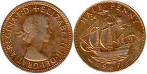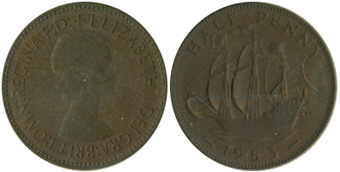 ![]() | 1/2 Penny KM# 882 | 1953 | bronze | Unc | The Golden Hind. In a set MS101 | ![]() | 1/2 Penny KM# 896 | 1967 1954-1967/1970 | bronze | XF | The Golden Hind. Obv.leg:W/o BRITT.OMN. |