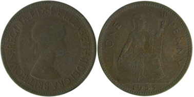 ![]() | 1 Penny KM# 883 | 1953 | bronze | Unc | Seated Britania. In a set MS101 |