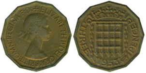 ![]() | 3 Pence KM# 886 | 1953 | nickel-brass | Unc | Crowned Portcullis. In a set MS101 |
