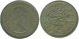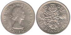 ![]() | 6 Pence KM# 903 | 1966 1954-1967/ 1970 | copper-nickel | XF | Flowers: Leek, Rose, Thistle & Shamrock. Obv.leg:W/o BRITT.OMN. |