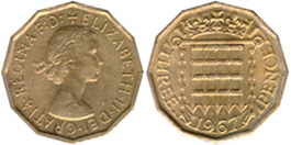 ![]() | 3 Pence KM# 900 | 1967 1954-1967/1970 | nickel-brass | Unc | Crowned Portcullis. Obv.leg:W/o BRITT.OMN. |