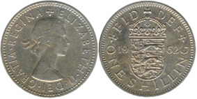 ![]() | 1 Shilling KM# 904 | 1962 1954-1966/1970 | copper-nickel | VF | English arms. Obv.leg:W/o BRITT.OMN. |