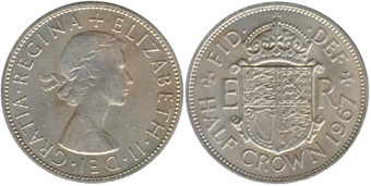 ![]() | 1/2 Crown KM# 907 | 1967 1954-1967/1970 | copper-nickel | VF | Obv.leg:W/o BRITT.OMN. |